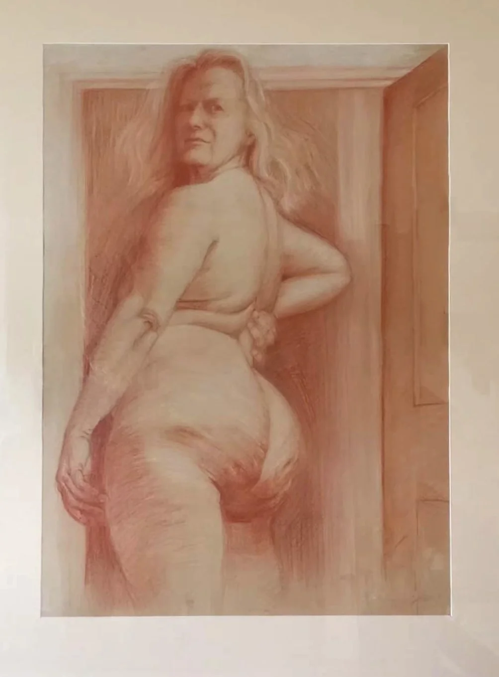 Yes, I did this with a big mirror. I decided not to take the drawing out of its frame for this photo. Forgive the reflections. 2013 conte
